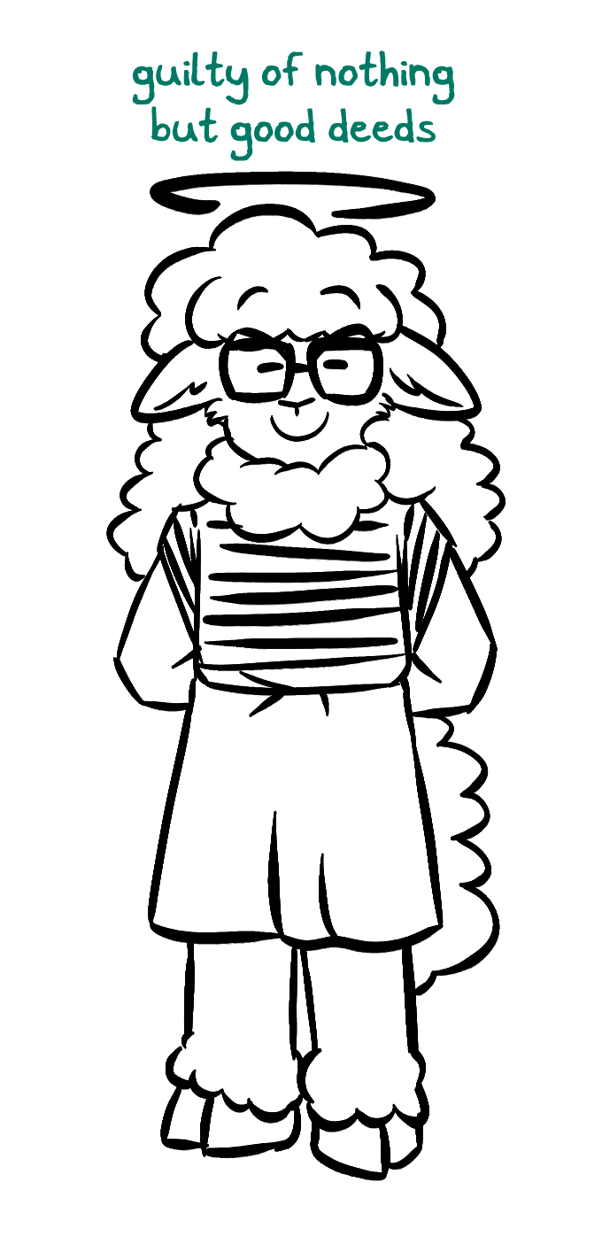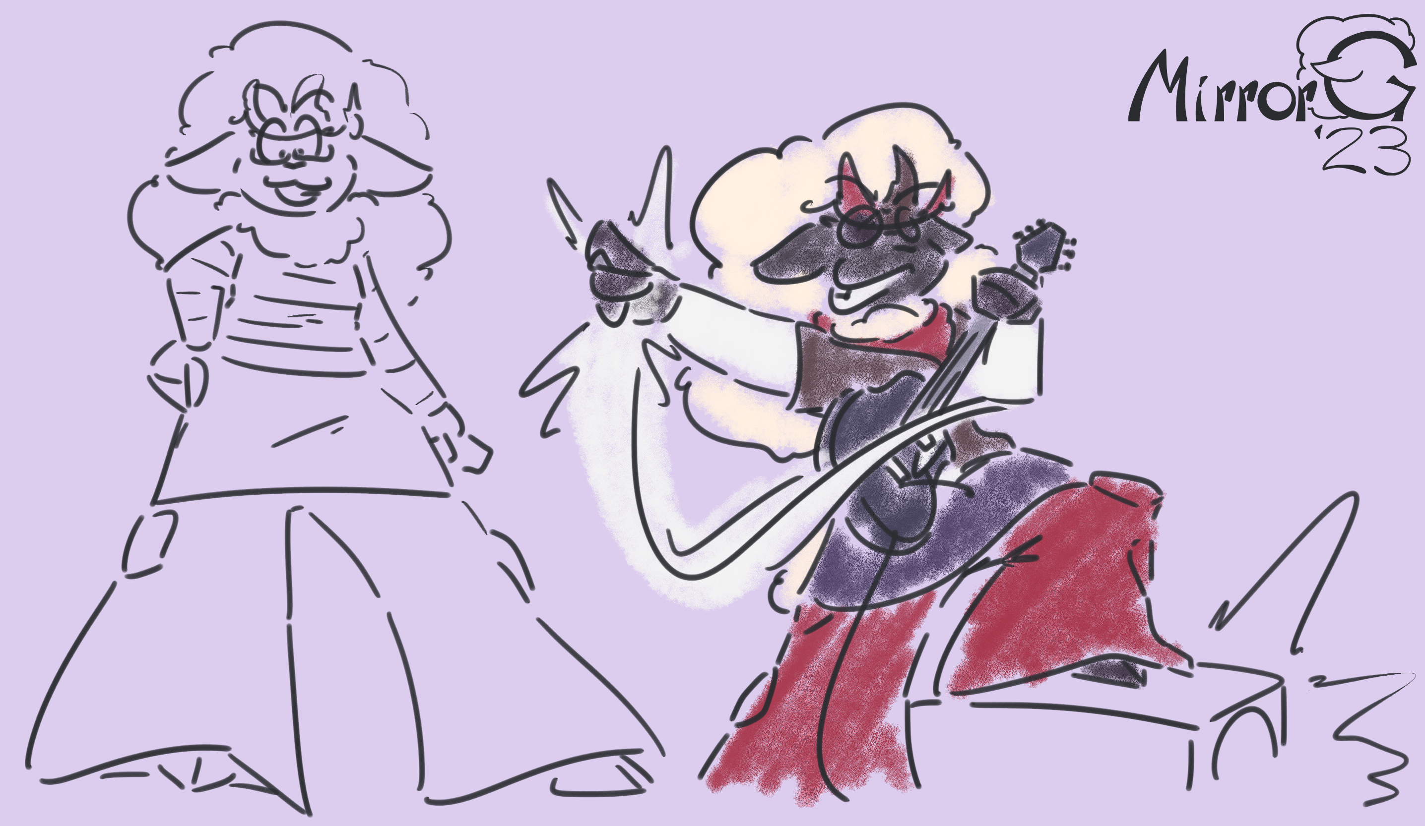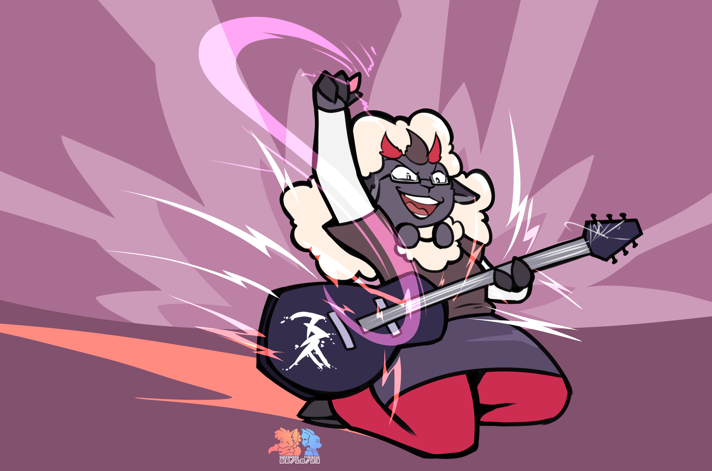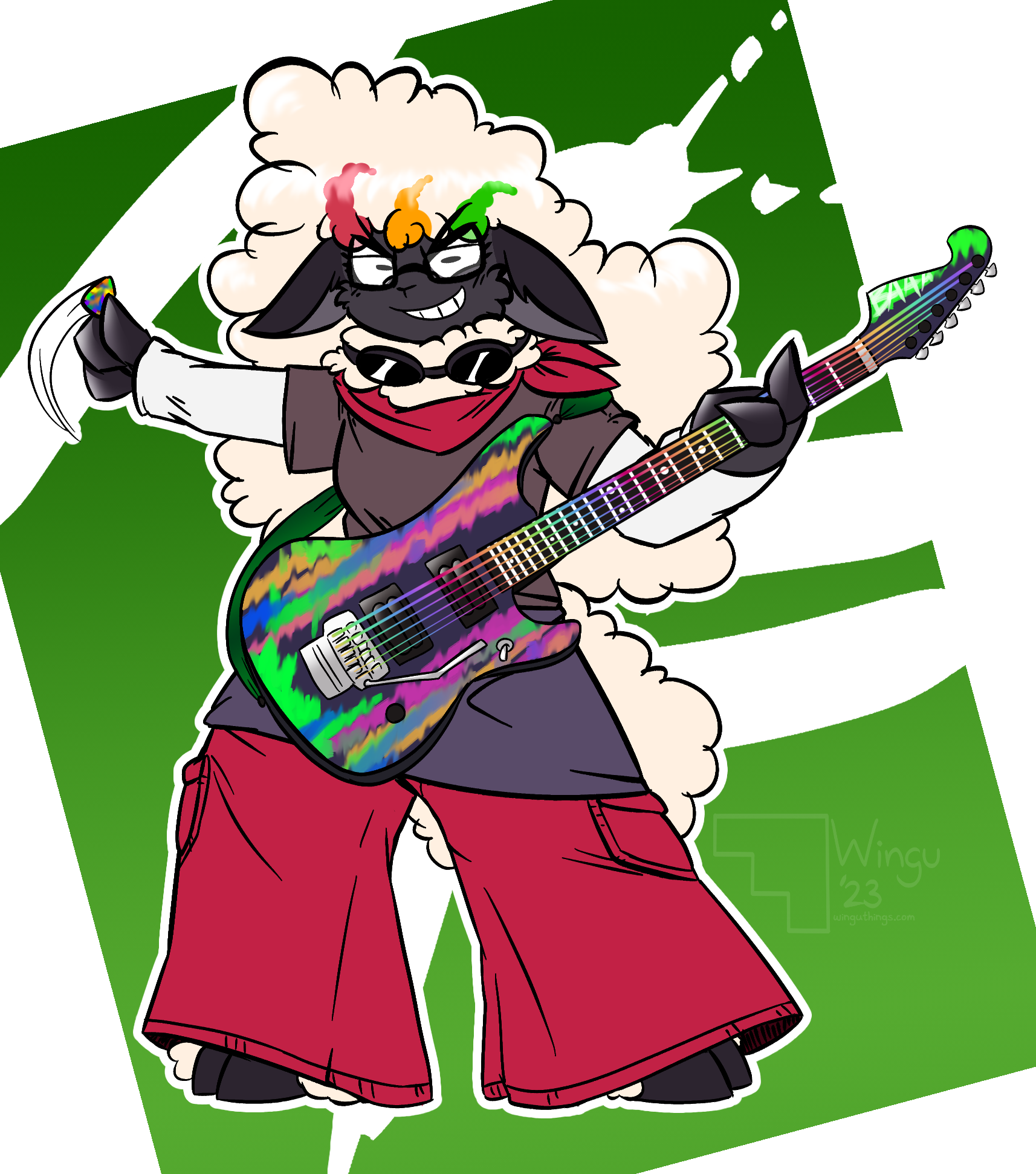 An eccentric sheep from the PNW with a love for the hardest rock genres there is, thrash metal in particular being her love. She's the youngest, and also newest member to the band, having joined in mid-2020. While a talented rhythm guitarist, her abilities go much further into not just music, but also art, being a wild and messy traditional painter. She dyes her wool various bright colors, and makes sure her guitars are always painted in bright, tie dye colors, even utilizing rainbow strings. She's wild and mischevious, often pranking or joking with her bandmates the most. Her most notable on-stage feature is her goggles, which she just thinks are pretty cool. At 5'3", she is the shortest member of the band and exudes a "gremlin" energy. This also typically manifests in her being one of the biggest risk takers in the band, sometimes putting her life in grave danger for "the bit." She's also the designer of the band's current "MF" logo.