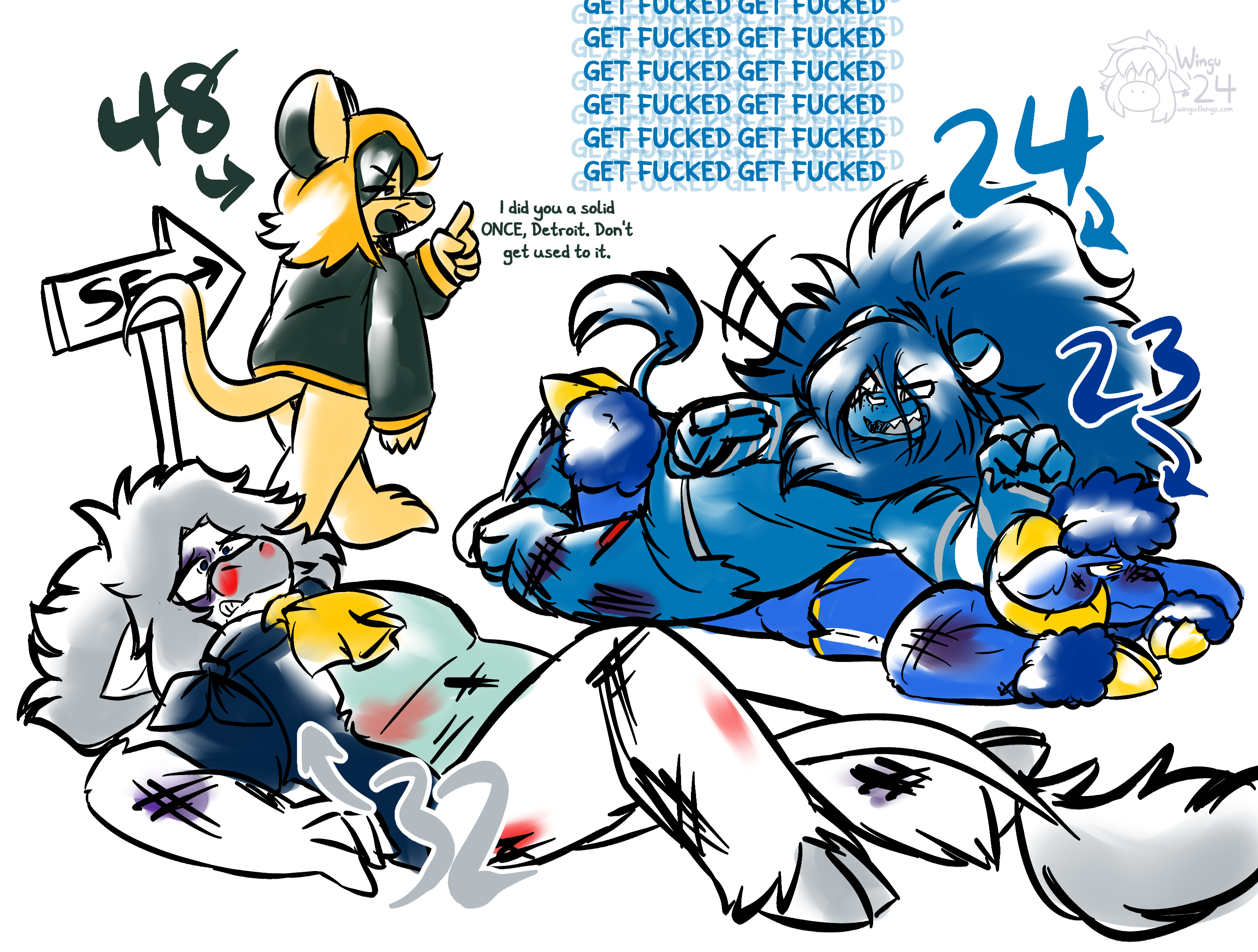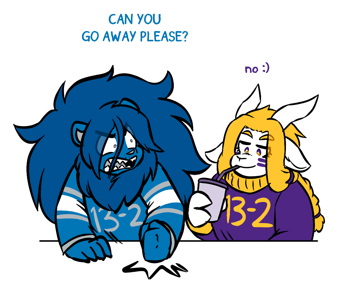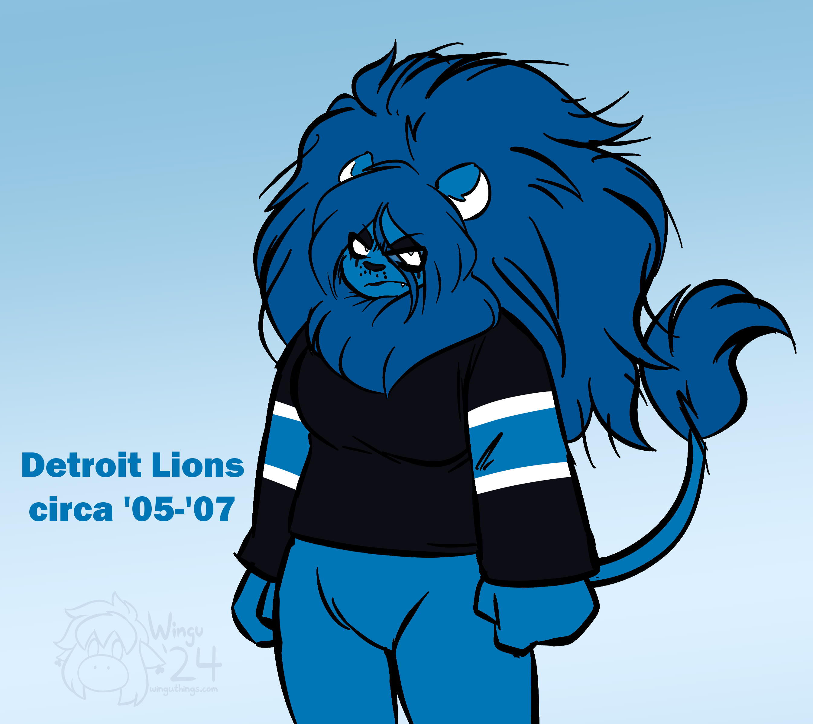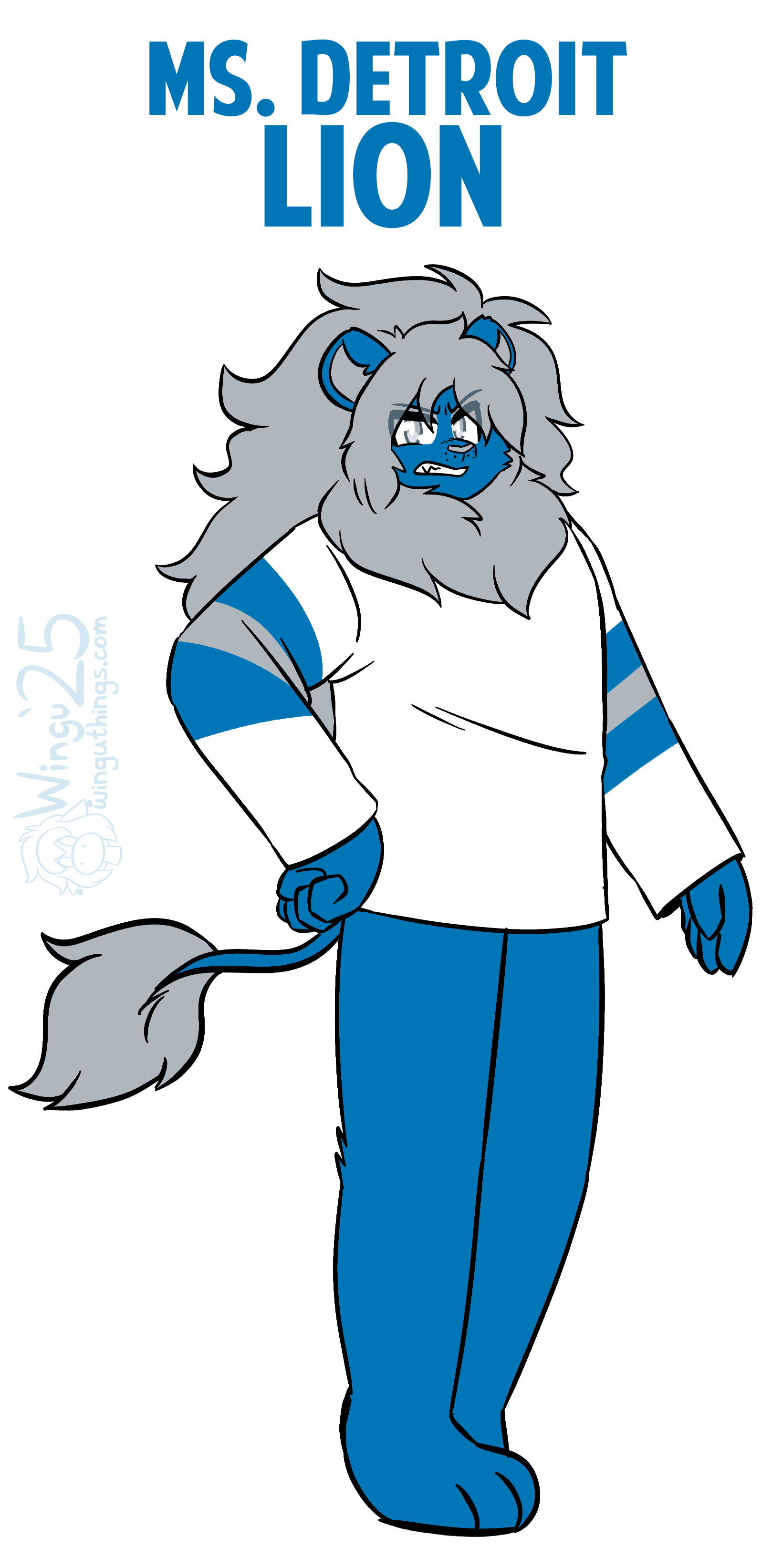 Ms. Detroit Lion entered the NFL as Ms. Portsmouth Spartan in 1930, but has remained consistent in identity since moving to Detroit in 1934. Seen as a perennial loser, she hasn't created any consistent success since several championship victories in the 50s. Many consider the franchise to be cursed by their scorned star player Bobby Layne, though many are hopeful for the franchise's prospects after a promising 2023 season, including a postseason run to the NFC Championship Game.