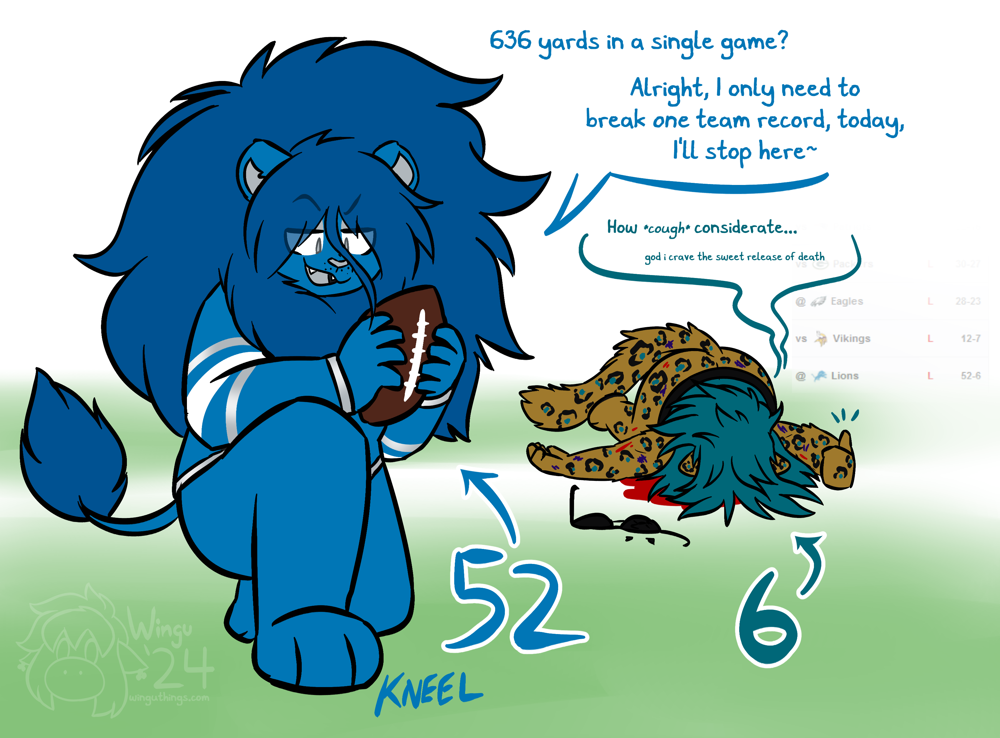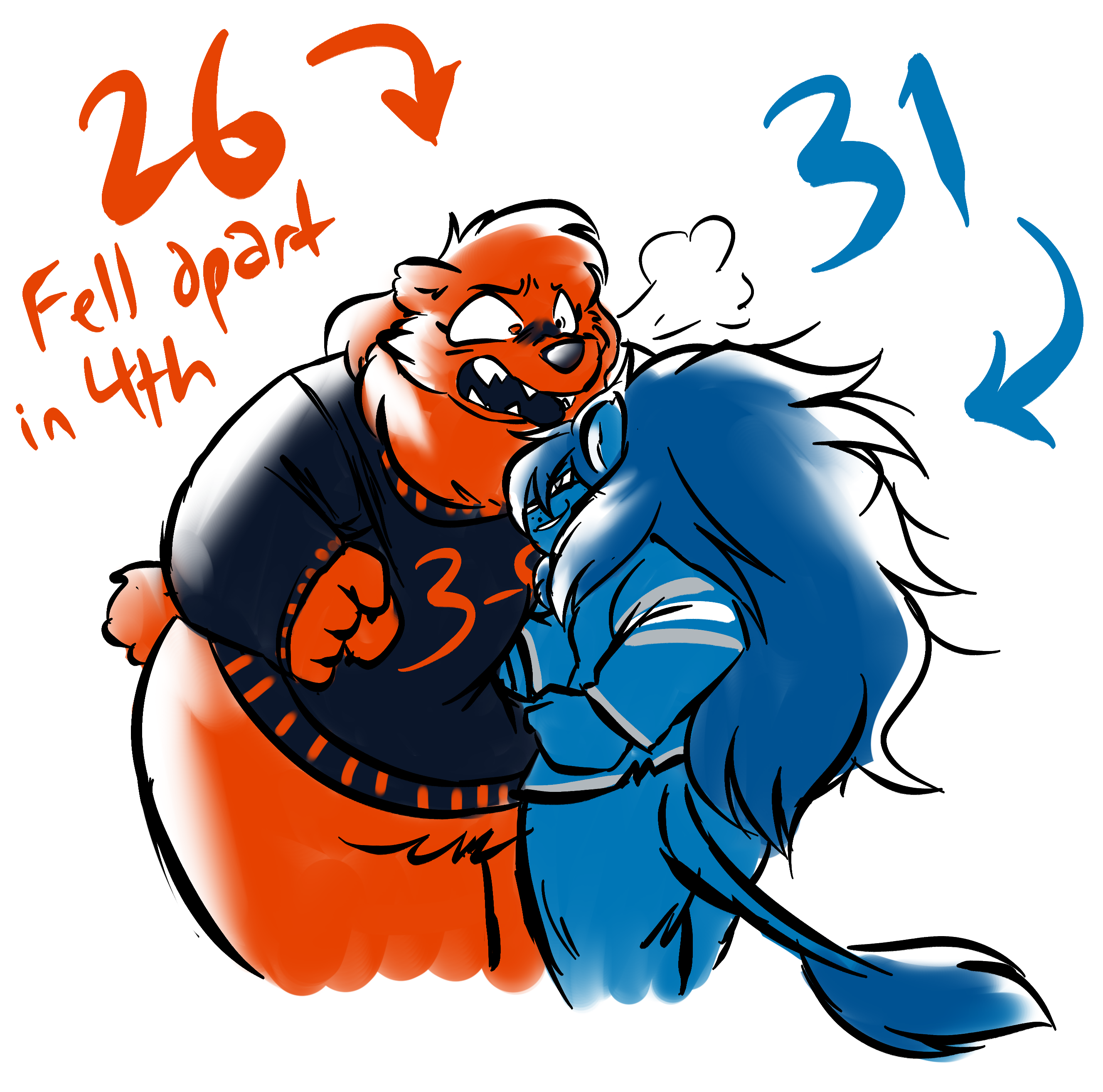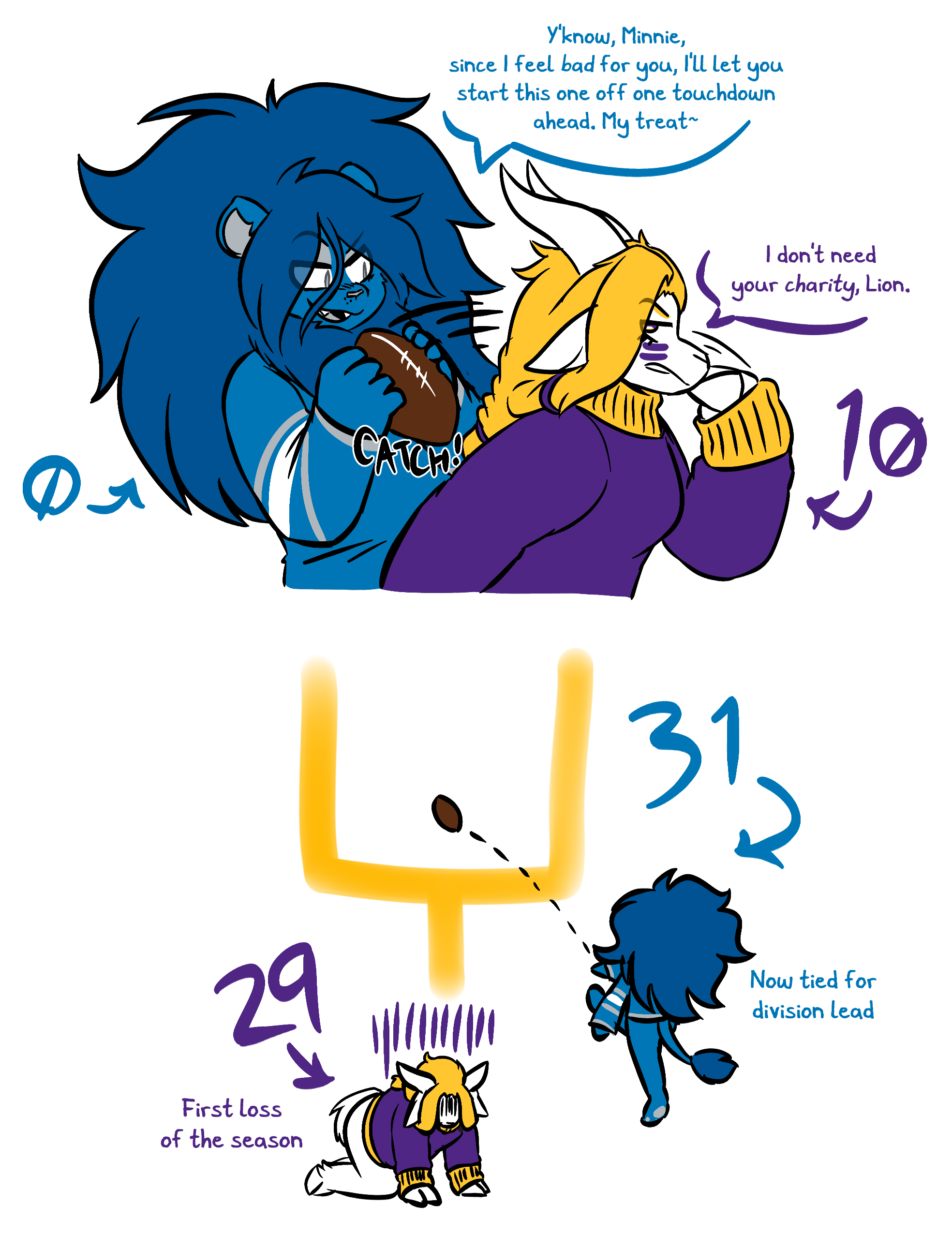 Ms. Detroit Lion entered the NFL as Ms. Portsmouth Spartan in 1930, but has remained consistent in identity since moving to Detroit in 1934. Seen as a perennial loser, she hasn't created any consistent success since several championship victories in the 50s. Many consider the franchise to be cursed by their scorned star player Bobby Layne, though many are hopeful for the franchise's prospects after a promising 2023 season, including a postseason run to the NFC Championship Game.