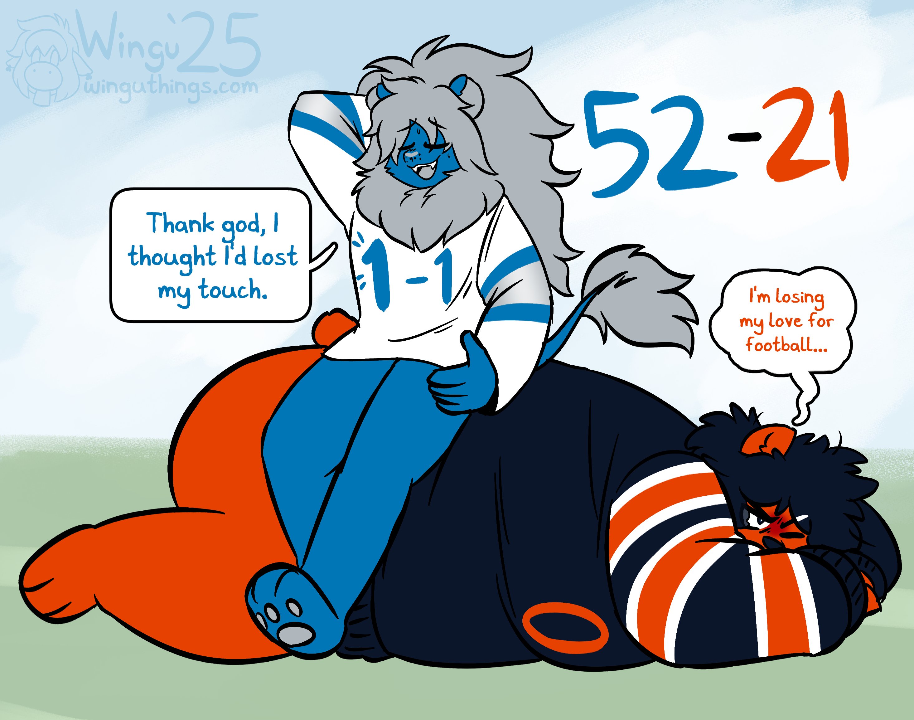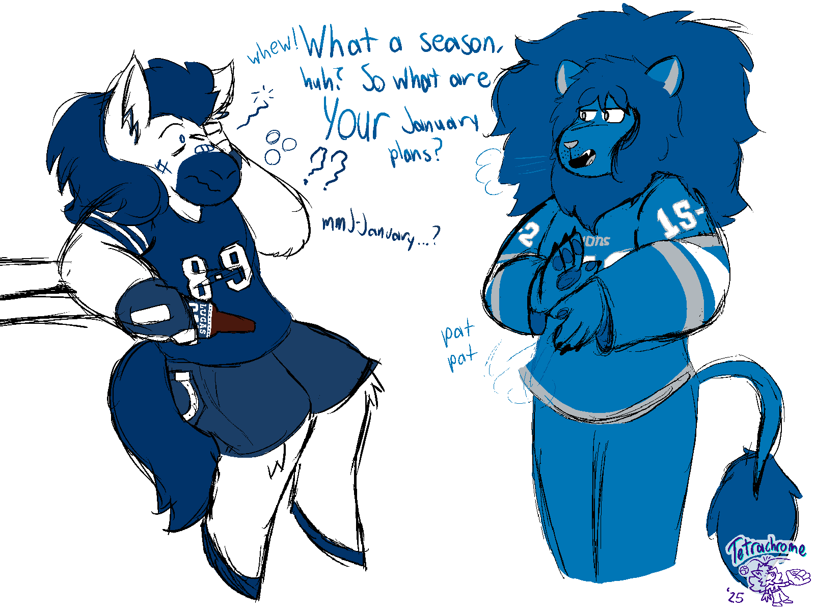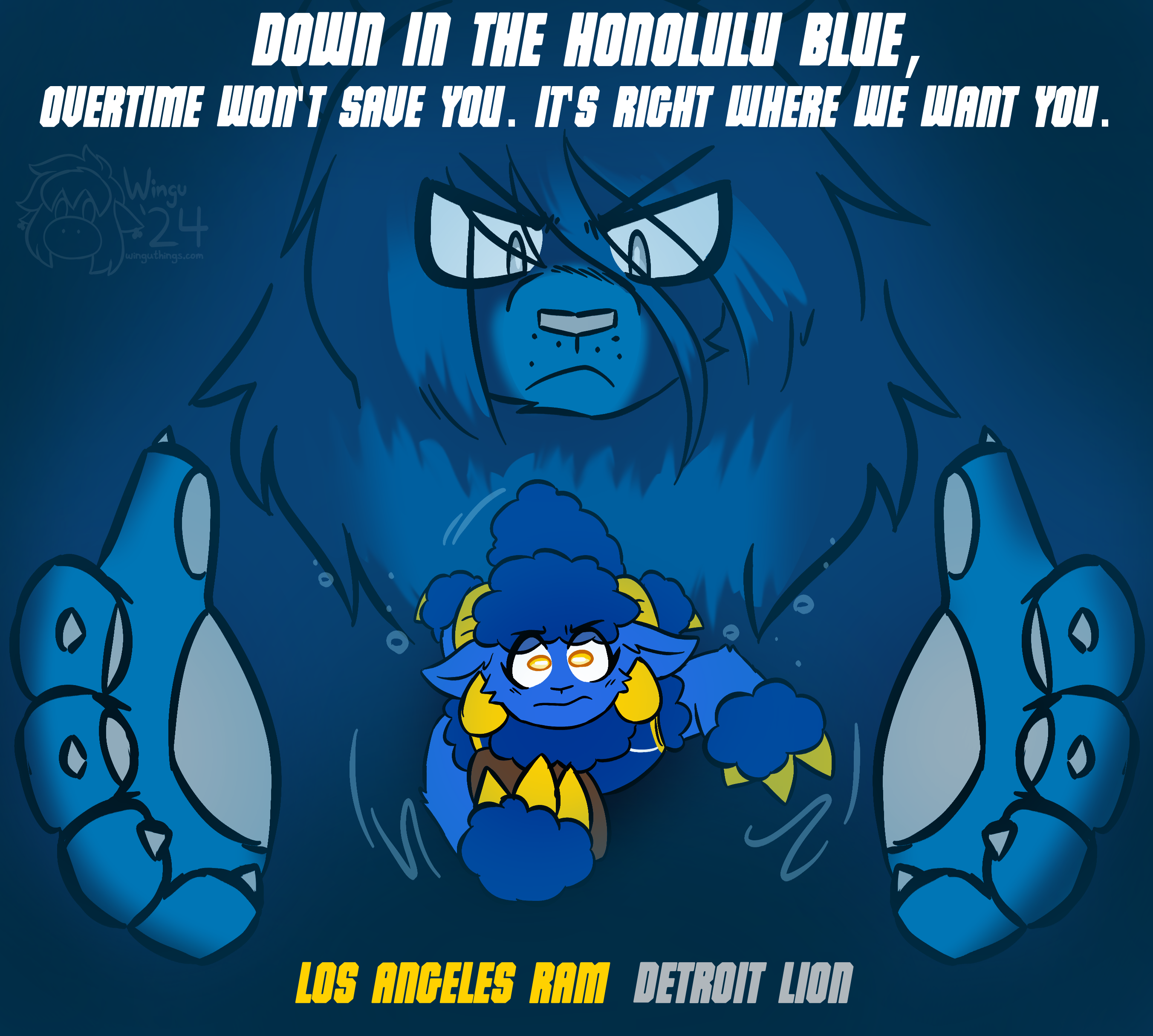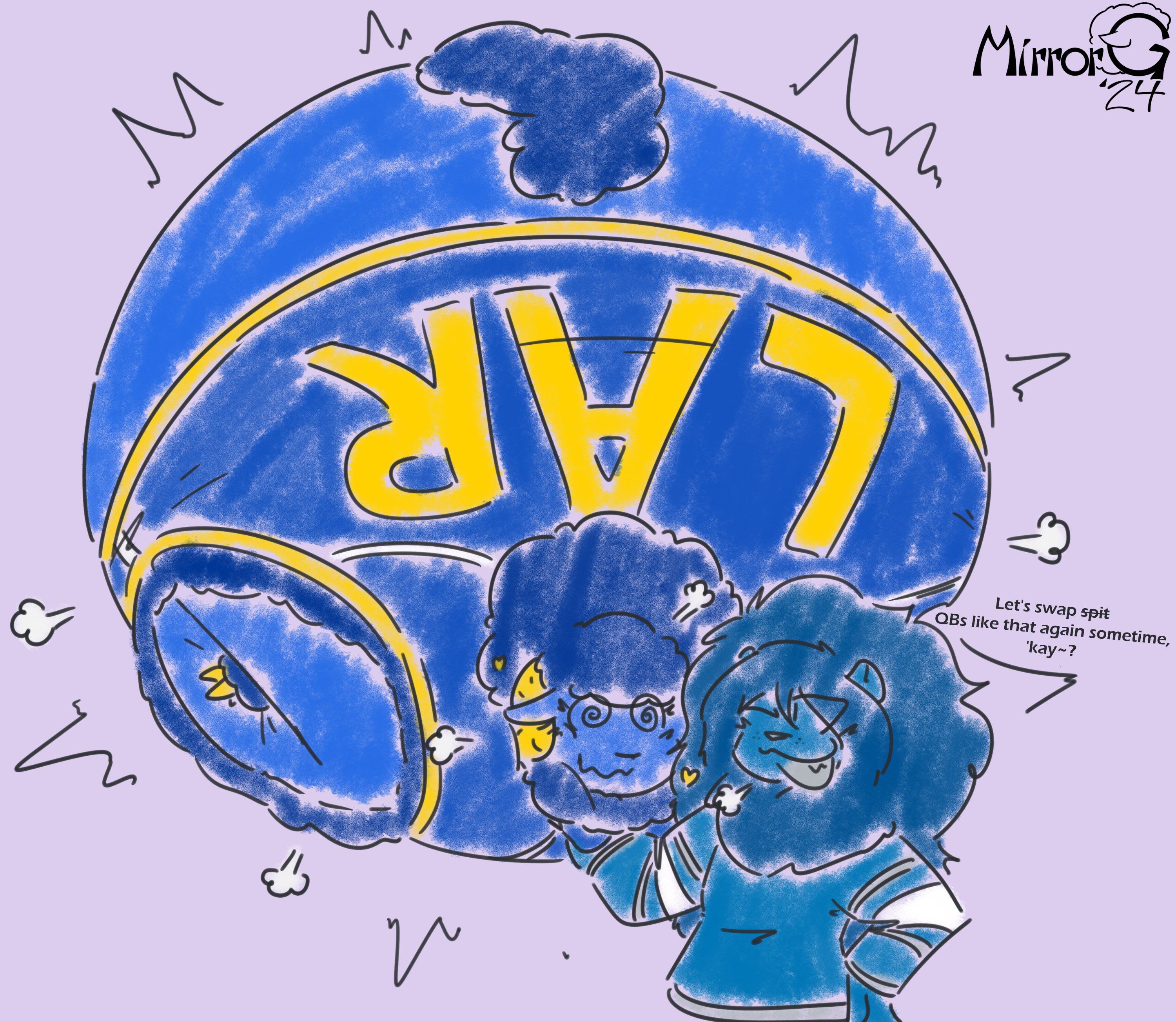 Ms. Detroit Lion entered the NFL as Ms. Portsmouth Spartan in 1930, but has remained consistent in identity since moving to Detroit in 1934. Seen as a perennial loser, she hasn't created any consistent success since several championship victories in the 50s. Many consider the franchise to be cursed by their scorned star player Bobby Layne, though many are hopeful for the franchise's prospects after a promising 2023 season, including a postseason run to the NFC Championship Game.